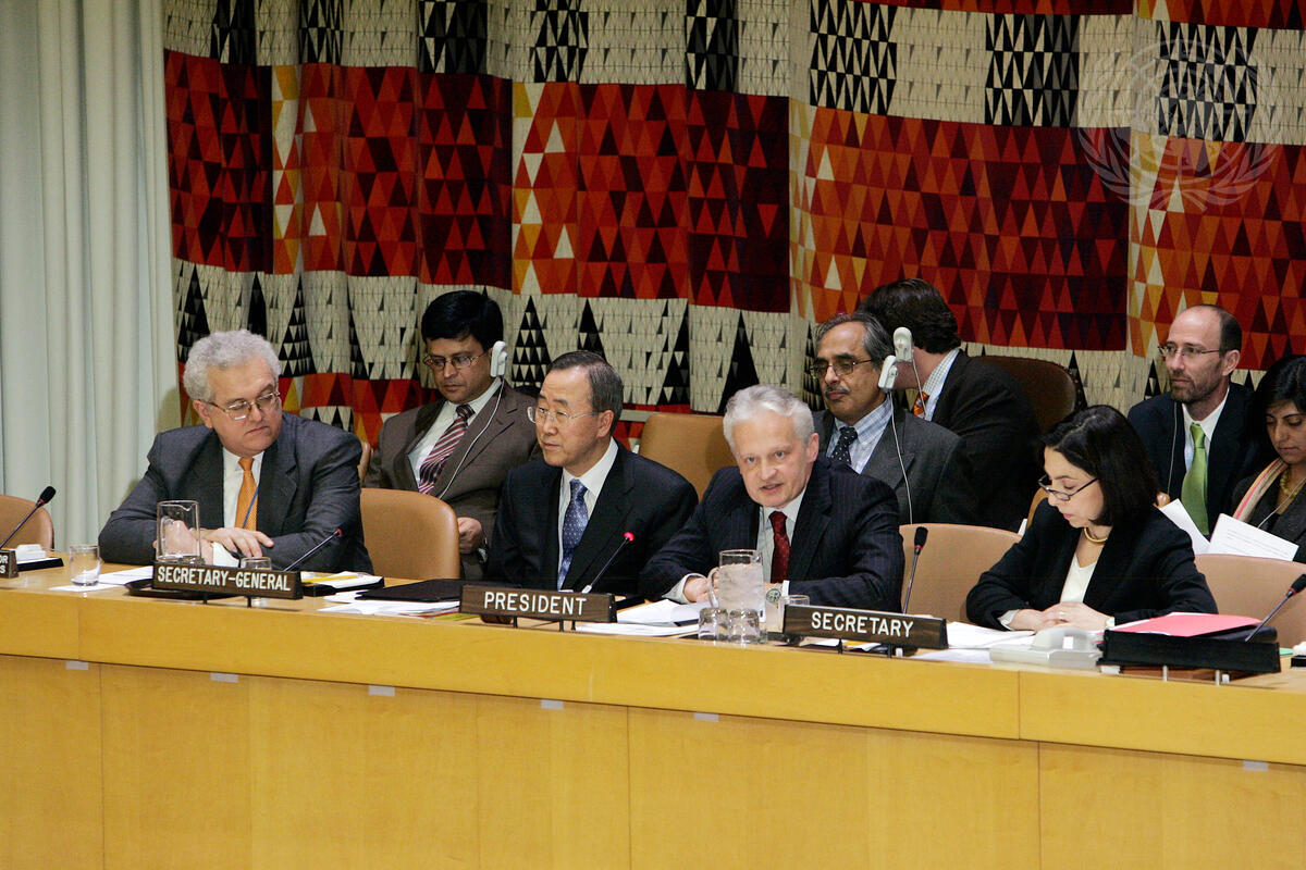 Incoming President of the UN Economic and Social Council (ECOSOC), Dalius Cekuolis (fourth from left), who is also the Permanent Representative of Lithuania to the United Nations, speaks after his election by the 2007 organizational ECOSOC session, at United Nations Headquarters in New York. Third from left is United Nations Secretary-General Ban Ki-moon.