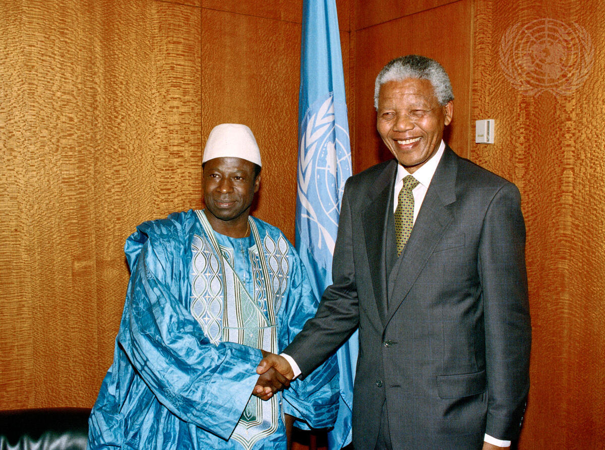 Amara Essy (left), of Cote d'Ivoire, President of the 49th session of the General Assembly, meets with President Nelson Mandela of South Africa.
