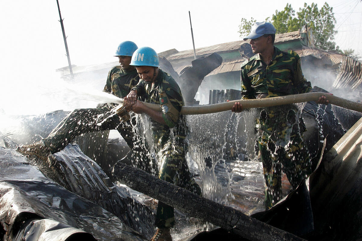 Police officers, residents and soldiers from the Bangladeshi contingent of the United Nations Mission in the Sudan (UNMIS) help to extinguish a fire which broke out in Konyo Konyo market, destroying a large section of the market, in Juba, Sudan.