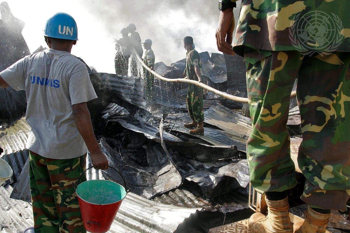 Police officers, residents and soldiers from the Bangladeshi contingent of the United Nations Mission in the Sudan (UNMIS) help to extinguish a fire which broke out in Konyo Konyo market, destroying a large section of the market, in Juba, Sudan.