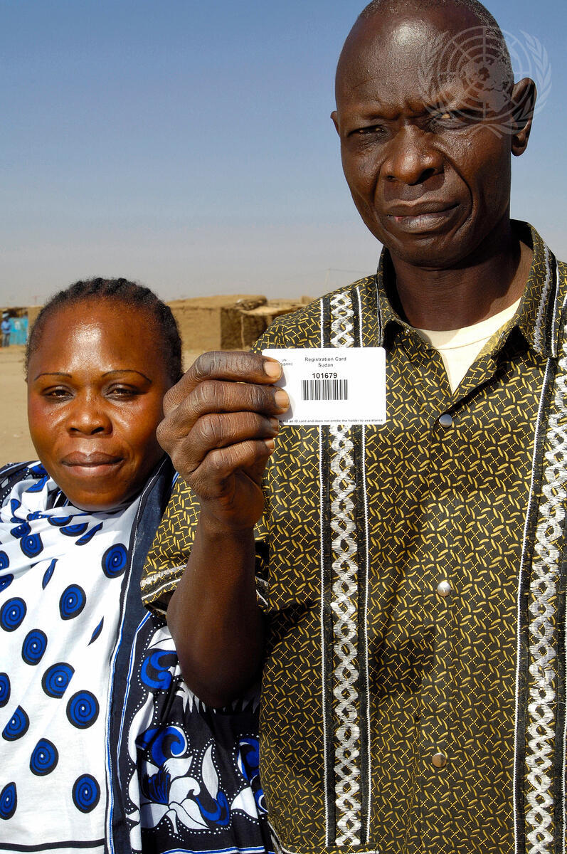On the way home, an internally displaced man from Soba Aradi with his wife, shows his family his registration card obtained at the St. James registration Center run by the International Organization of Migration (IOM), backed by the Returns, Reintegration and Recovery Programme of the UN Mission in Sudan.