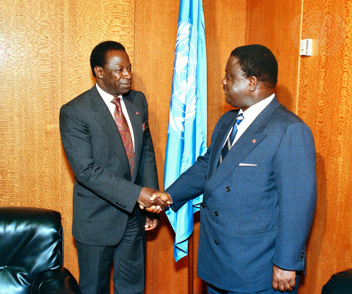 Amara Essy (left) of Côte d'Ivoire, President of the 49th session of the General Assembly, shaking hands with Henri Konan Bedie, President of Côte d'Ivoire.