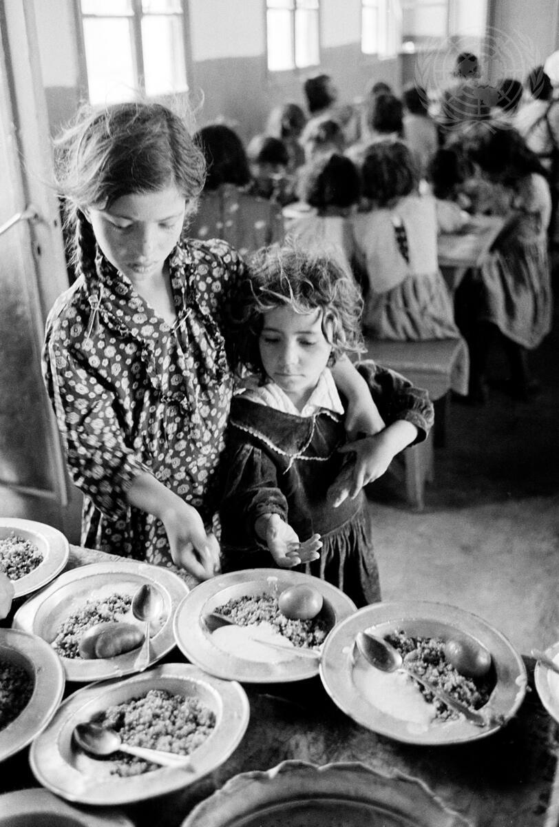 Refugee children receiving a supplementary meal at the Dheisheh camp, near Bethlehem, Jordan. In Jordan alone more than 20,000 children were registered for supplementary feeding between 1959 and 1960.