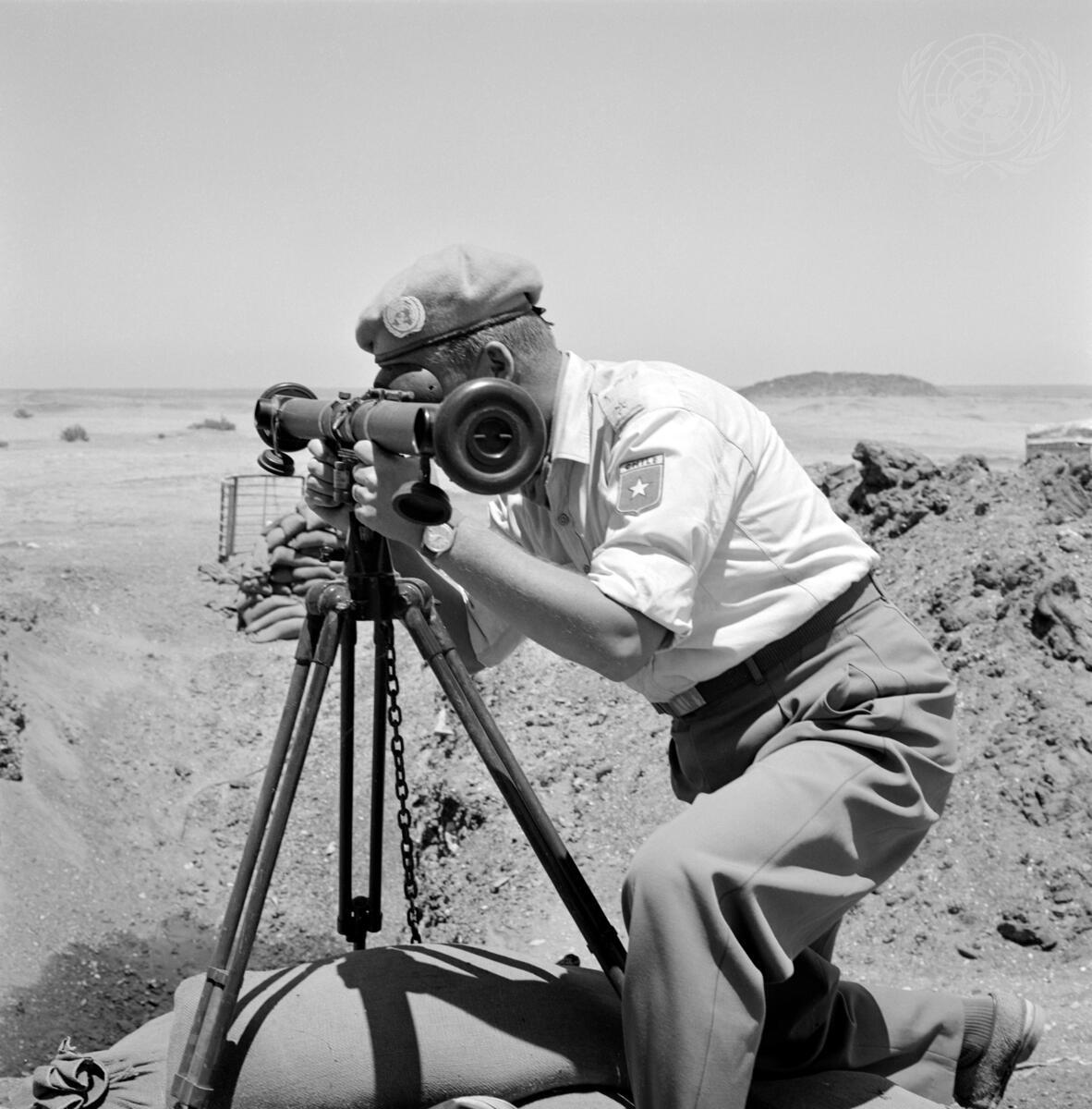 Major L. Prussing (Chilean Army) observing from Observation Post GREEN.