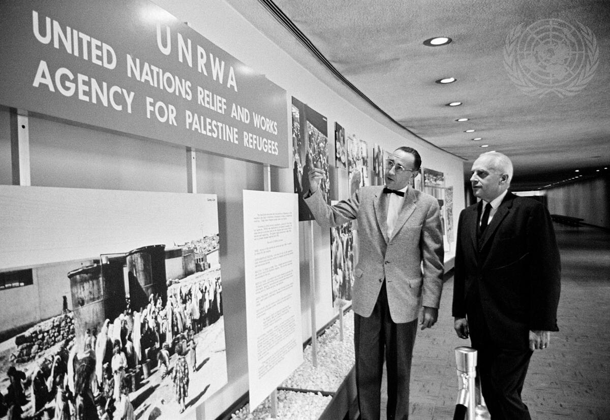 Dr. John H. DAVIS (right), Director of the U.N. Relief and Works Agency for Palestine Refugees in the Near East (UNRWA) is seen here with Mr. Marvin WEILL of the U.N. Photographs and Exhibits Service, viewing an exhibit which was set up by the Agency in November 1961, at U.N. Headquarters.