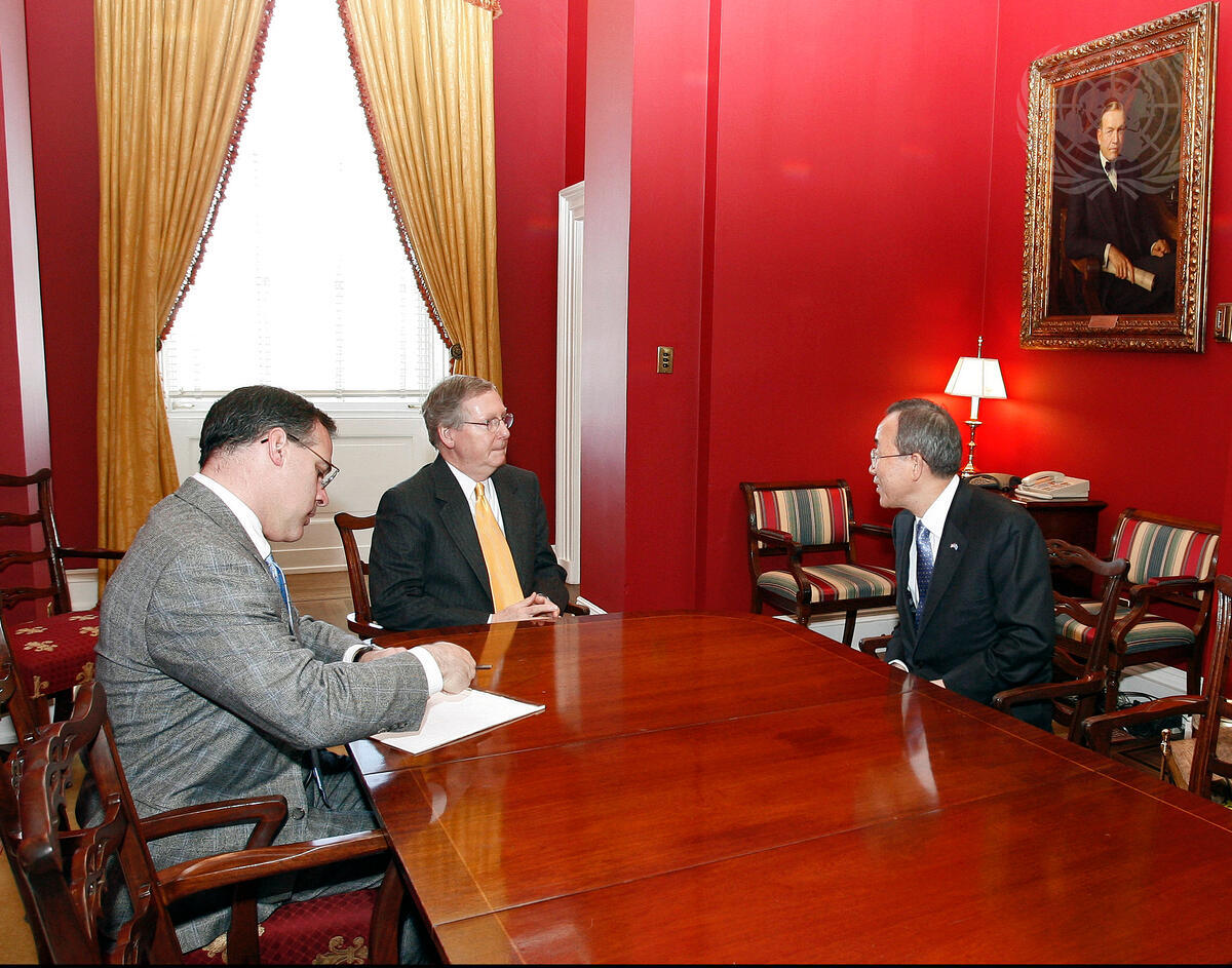 Secretary-General Ban Ki-moon (right) meets Senator Mitch McConnell (centre) (R-Kentucky; Senate Minority Leader) on Capitol Hill, in Washington, D.C.