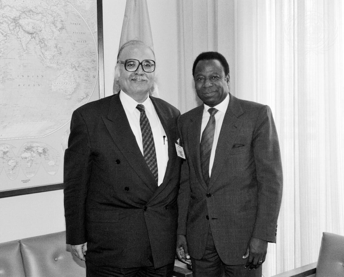 Amara Essy (right), Cote D'Ivoire, President of the General Assembly, meets with Omar Mustafa Muntasser, Foreign Minister of Libyan Arab Jamahiriya.