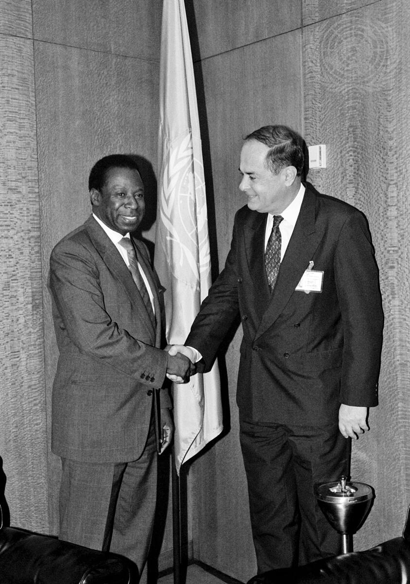 General Assembly President Amara Essy (left), of Cote d'Ivoire shaking hands with Vladislav Jovanovic, Foreign Minister of the Federal Republic of Yugoslavia.