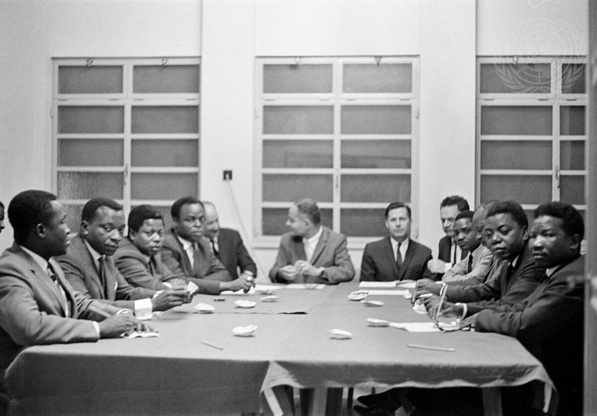 A series of talks were held yesterday and today between Mr. Cyrille Adoula, Prime Minister of the Republic of the Congo (Leopoldville) and Mr. Moise Tshombe, President of the Provincial Government of Katanga, at the UN-occupied base at Kitona. The Meeting was arranged with the assistance of the UN Organization in the Congo (ONUC) and US Ambassador Edmond Gullion. In the early hours of 21 December following the conclusion of the talks are (left to right): Mr. Rémy Mwamba, Justice Minister of the Republic of the Congo; Prime Minister Cyrille Adoula; Mr. Justin Bomboko, Foreign Minister of the Republic of the Congo; Mr. Christophe Gbenye, Interior Minister of the Republic of the Congo; Mr. Mahmoud Khiary (UN); Dr. Ralph J. Bunche, UN Under-Secretary for Special Political Affairs; United States Ambassador Edmund Gullion; Mr. Georges Dumontet (UN); Mr. Meli, Provincial Government of Katanga; Mr. Jean-Baptiste Kibwe, Finance Minister of the Provincial Government of Katanga; President Moise Tshombe of the Provincial Government of Katanga; and Mr. Odilon Mwenda, Provincial Government of Katanga.
