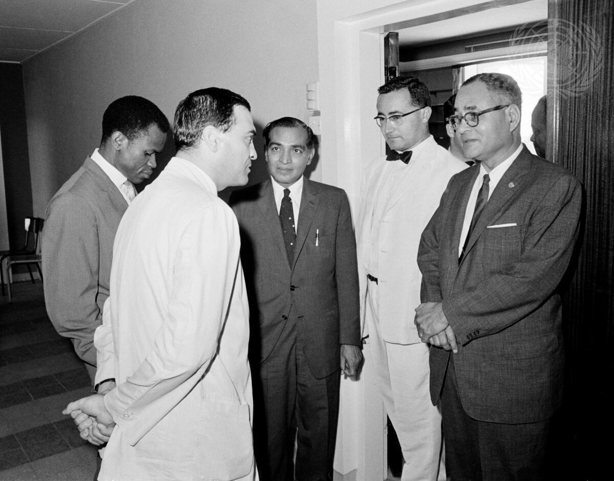 Dr. Bunche (right) is seen conversing with Mr. M. Salducci, of the ONUC Fellowship Unit, as he visited the National School of Law and Administration (ENDA), in Leopoldville. Looking on are (from left): Mr. Etienne Tshisekedi, Director General of ENDA, Mr. S. Habib Ahmed, Chief of Civilian Operations in the Congo; and Mr. Michel Rougevin-Baville, Director of Classes at ENDA.