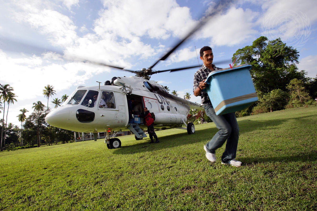 An Electoral Officer accompanied by the United Nations Police (UNPOL), carries electoral material from the helicopter for distribution in Alas, Timor-Leste in preparation for the up-coming parliamentary elections.