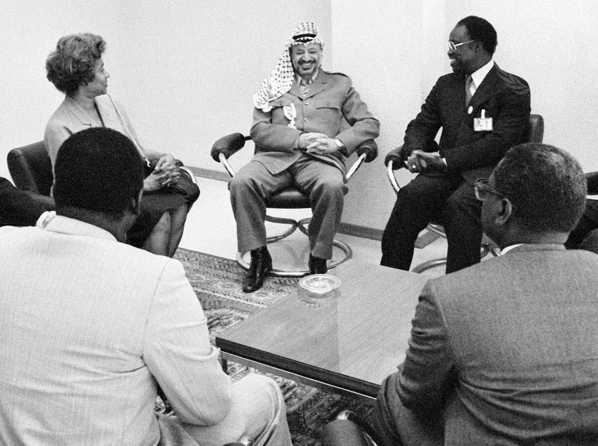 Seen in an informal meeting before Mr. Arafat's address this morning are, clockwise from extreme left,: Nabil Ramlawi (PLO), Permanent Observer to the UN Office at Geneva (UNOG); Lucille Mair, Secretary-General, International Conference on the Question of Palestine (ICQP); Yasser Arafat; Mustapha Niasse (Senegal), President of ICQP; Erik Suy, Director-General, UNOG; (with backs to the camera) Massamba Sarre (Senegal), Chairman, Committee on the Exercise of the Inalienable Rights of the Palestinian People; and Alioune Sene (Senegal), Permanent Representative to UNOG.
