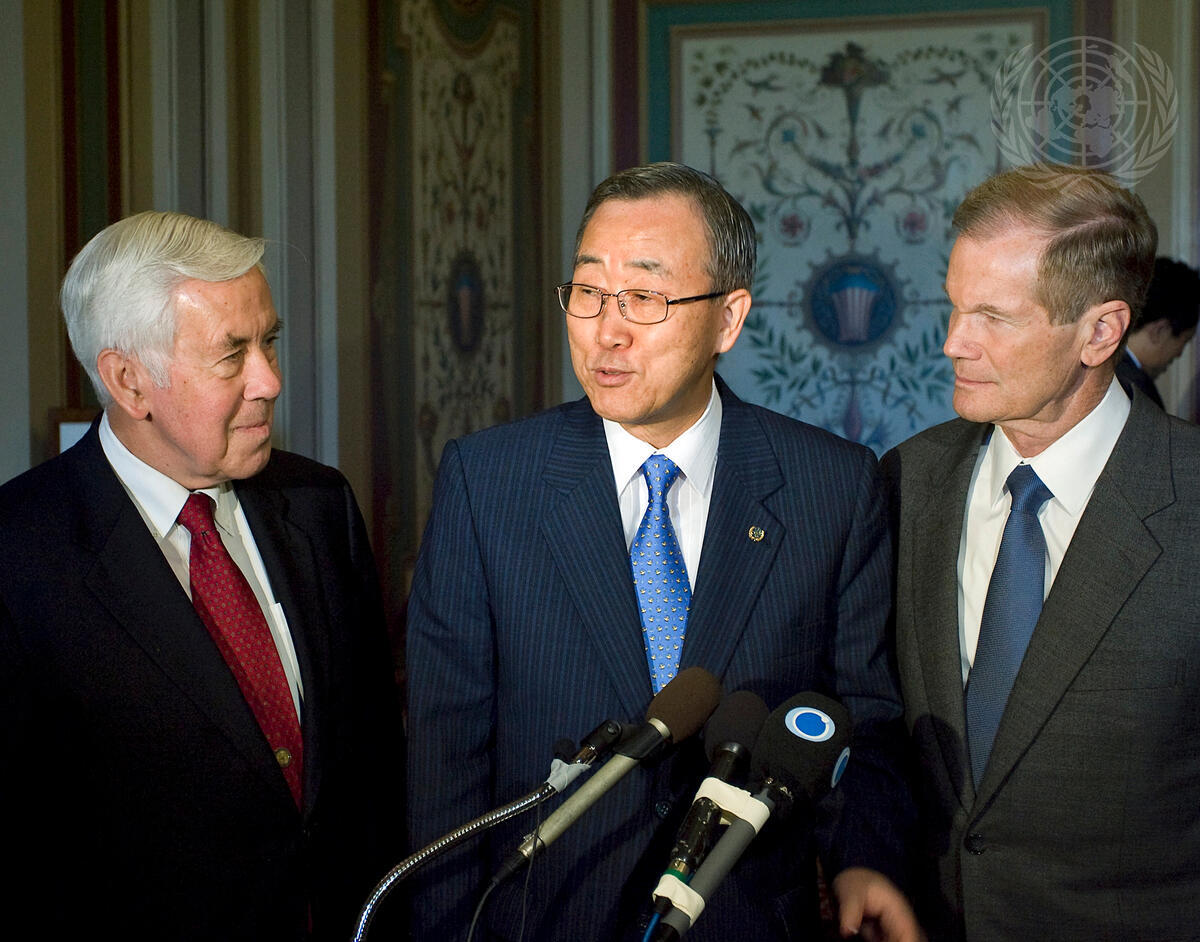 Secretary-General Ban Ki-moon (centre) speaks to journalists after meeting with the members of the United States Senate Foreign Relations Committee in Washington D.C.