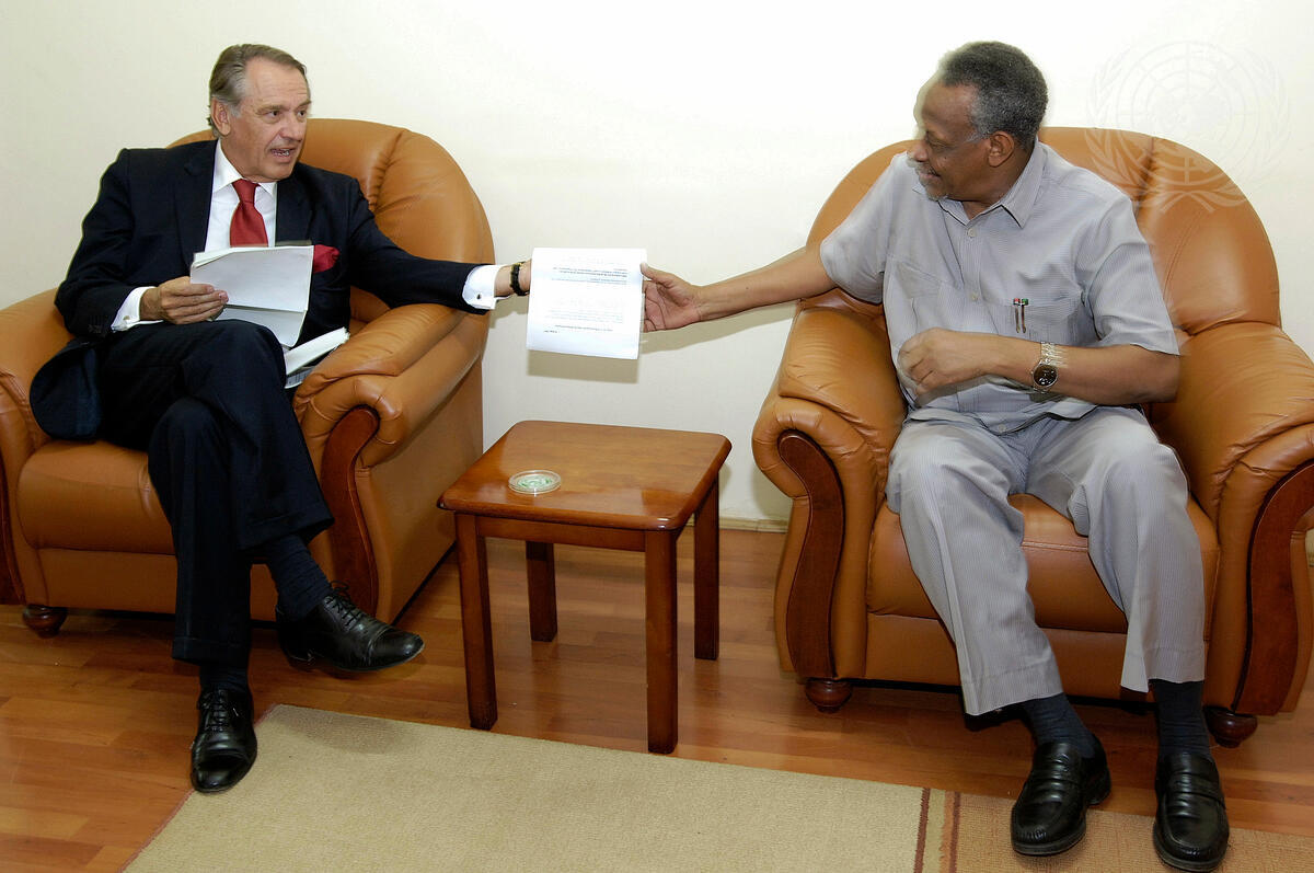 Jan Eliasson (left), UN Special Envoy for Darfur, gives a copy of the roadmap to Nafie al-Nafie, Sudan's Presidential Assistant in Khartoum, Sudan.