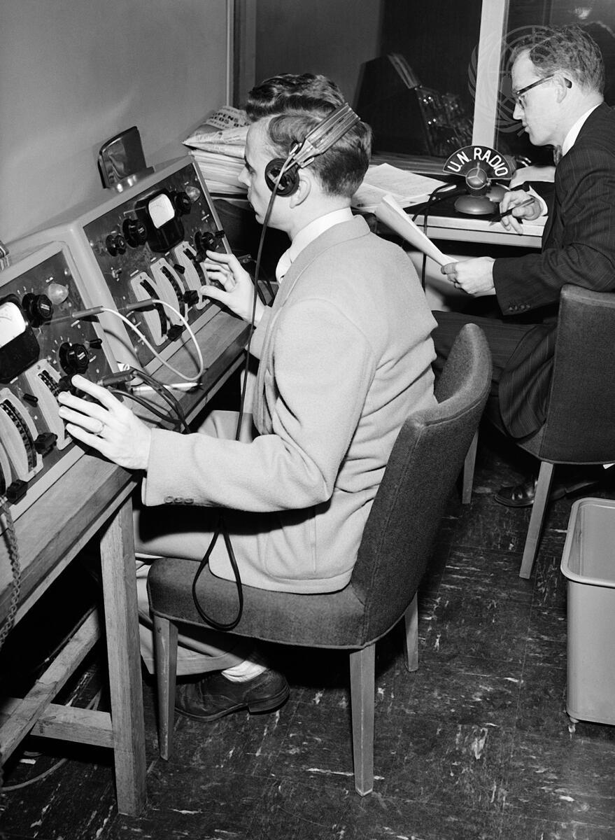 One of the rebroadcasting rooms of United Nations Radio, in a booth overlooking a Council chamber. The sound engineer is in the foreground; the announcer near the window. The proceedings of meetings of the General Assembly and of the three UN councils, as well as those of some of the commissions, are entirely recorded by the Radio Division.