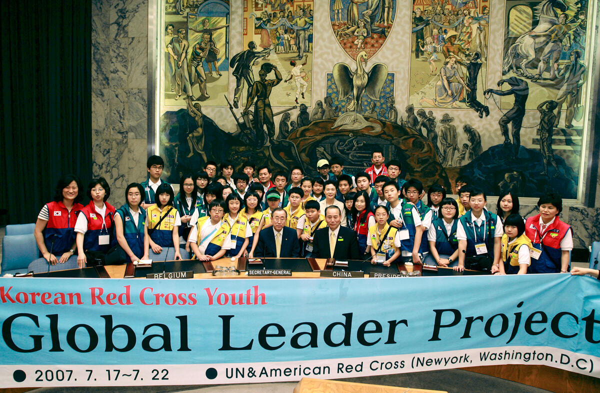 Secretary-General Ban Ki-moon (left, seated) is in a group photo with the Korean Red Cross youth students in the Security Council chamber, at UN Headquarters in New York.