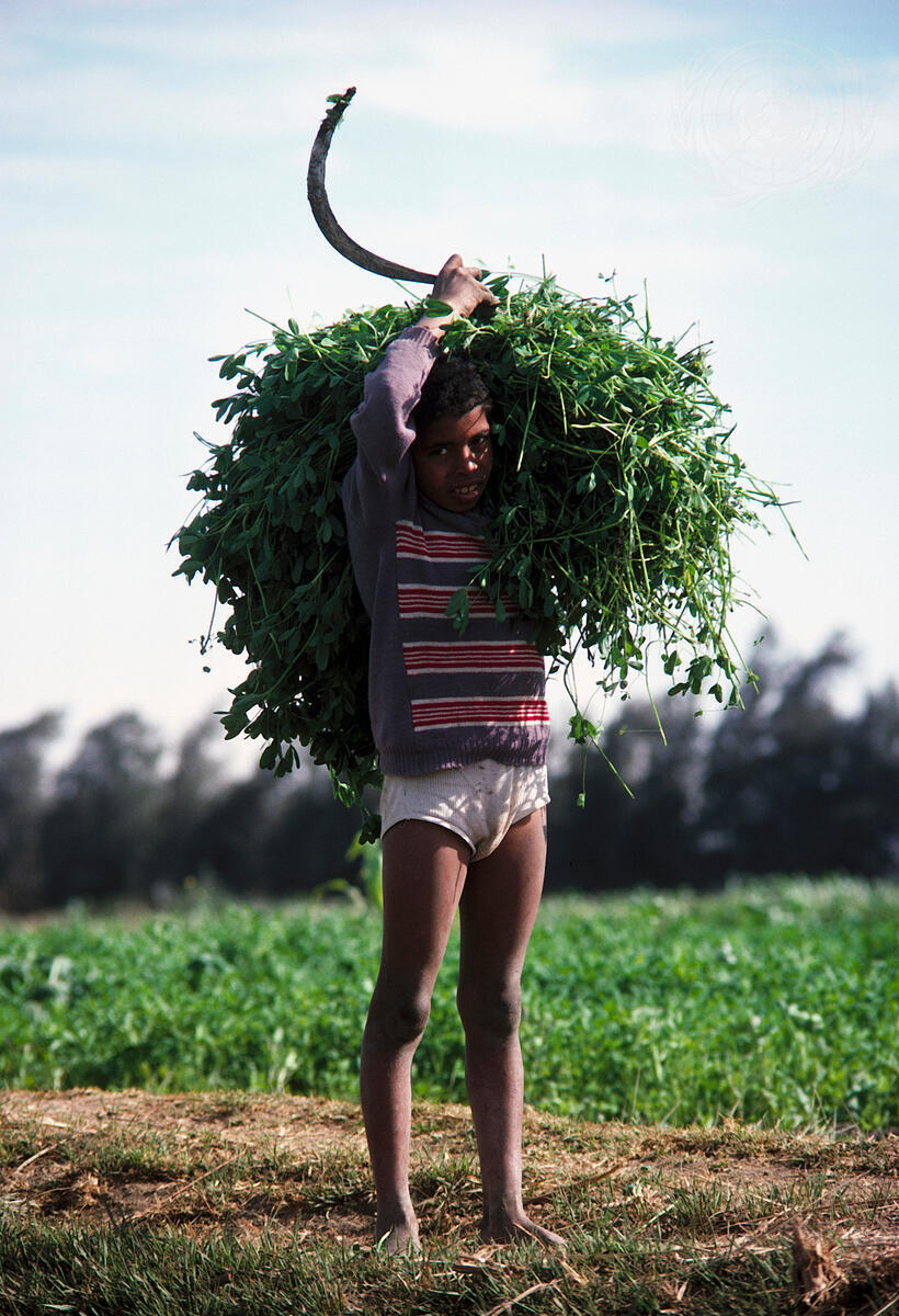 Of the world's 56 million working children, approximately 80 percent are classified as ""unpaid family workers"" according to the International Labor Office. An Egyptian boy carries a load of plant cuttings for processing.