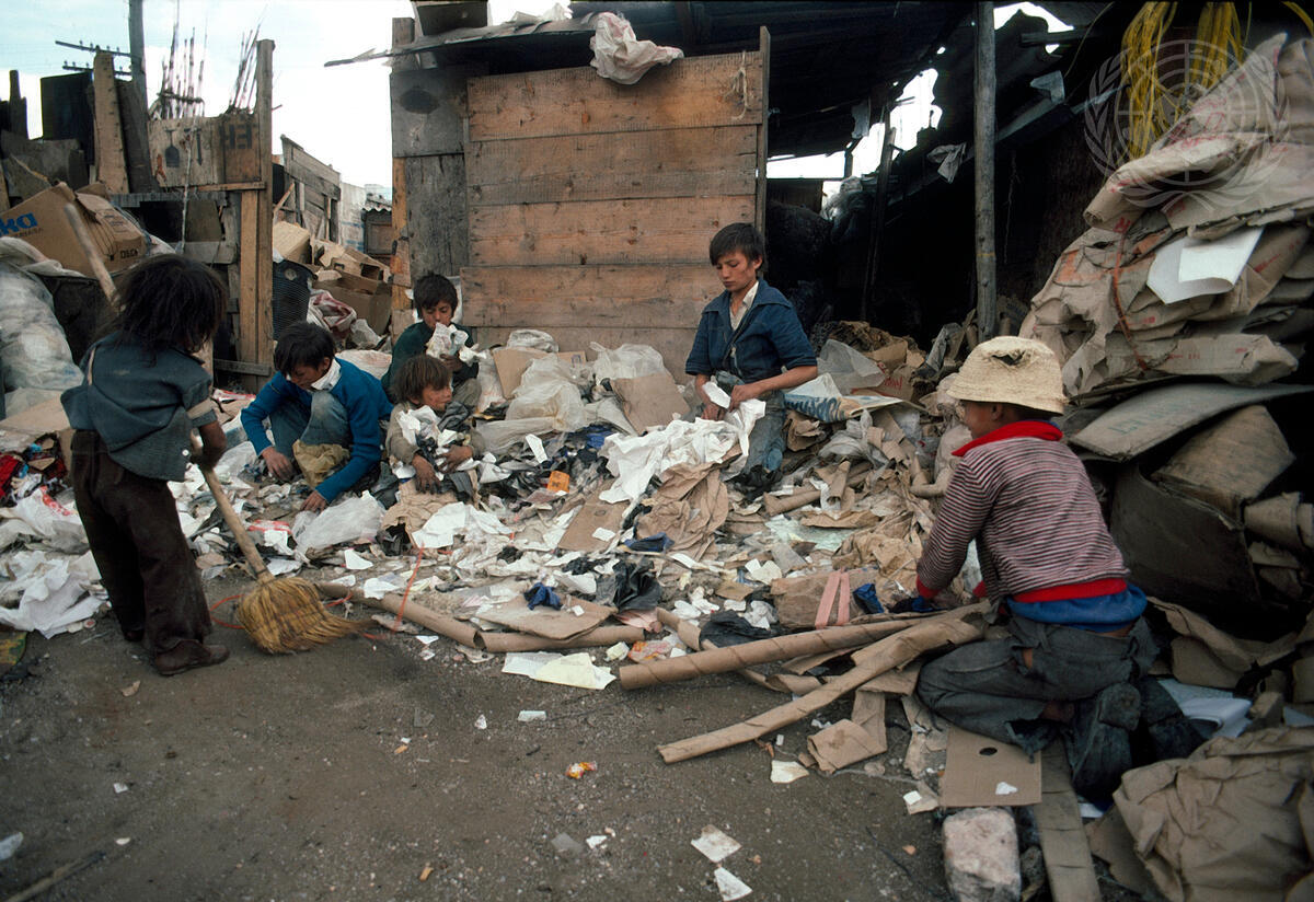 In Bogota, thousands of children without homes - called ""gamines"" - subsist by scavenging, begging and stealing. Colombian children rummage through a thrash heap searching for saleable items.