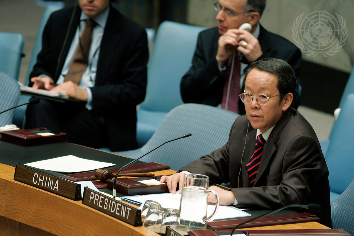 Guangya Wang, Permanent Representative of the People's Republic of China, and President of the Security Council for July, presides over the Council meeting reviewing progress report of the investigation into the assassination of the former Prime Minister of Lebanon Rafik Hariri, at UN Headquarters in New York.