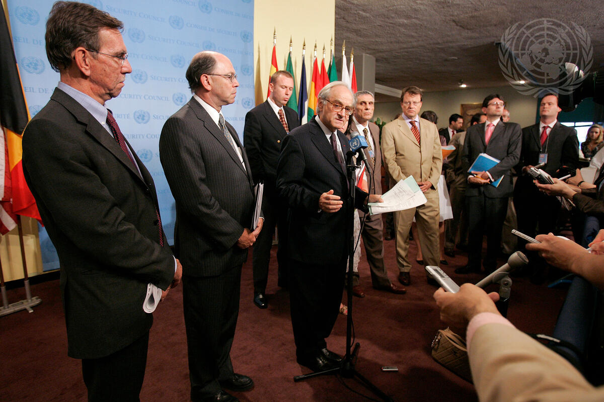 Jean-Marc de la Sablière(at mic), Permanent Representative of France to the United Nations, speaks to journalists outside the Security chamber, at UN Headquarters in New York.