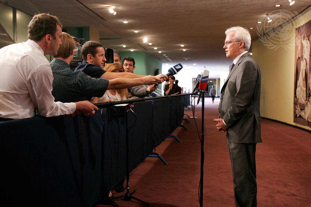 Vitaly Churkin, Permanent Representative of the Russian Federation, briefs journalists outside the Security Council chamber, at UN Headquarters in New York.