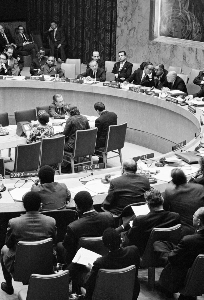 At the Council table (from left) are: Nathan Barnes (Liberia); Turgut Menemencioglu (Turkey); U Thant, Acting Secretary-General of the UN conferring with Ralph J. Bunche, Under-Secretary for Special Political Affairs; and Valerian A. Zorin (USSR), President of Security Council.