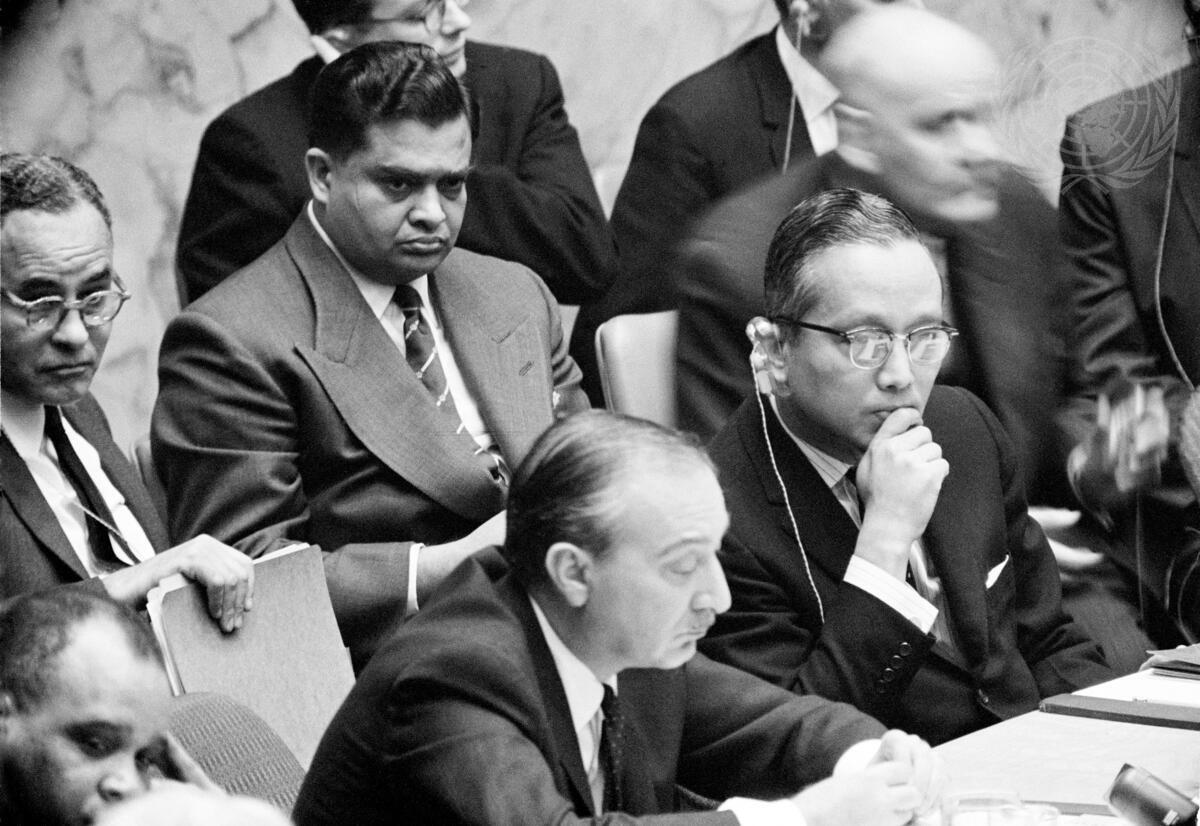 Ambassador Turgut Menemencioglu (left, at desk), of Turkey and Acting Secretary-General U Thant, photographed as they attended this morning's meeting of the Security Council. Behind them are Dr. Ralph Bunche (left), UN Under-Secretary for Special Political Affairs, and General I.J. Rikhye, Military Adviser to the Secretary-General on the Congo.