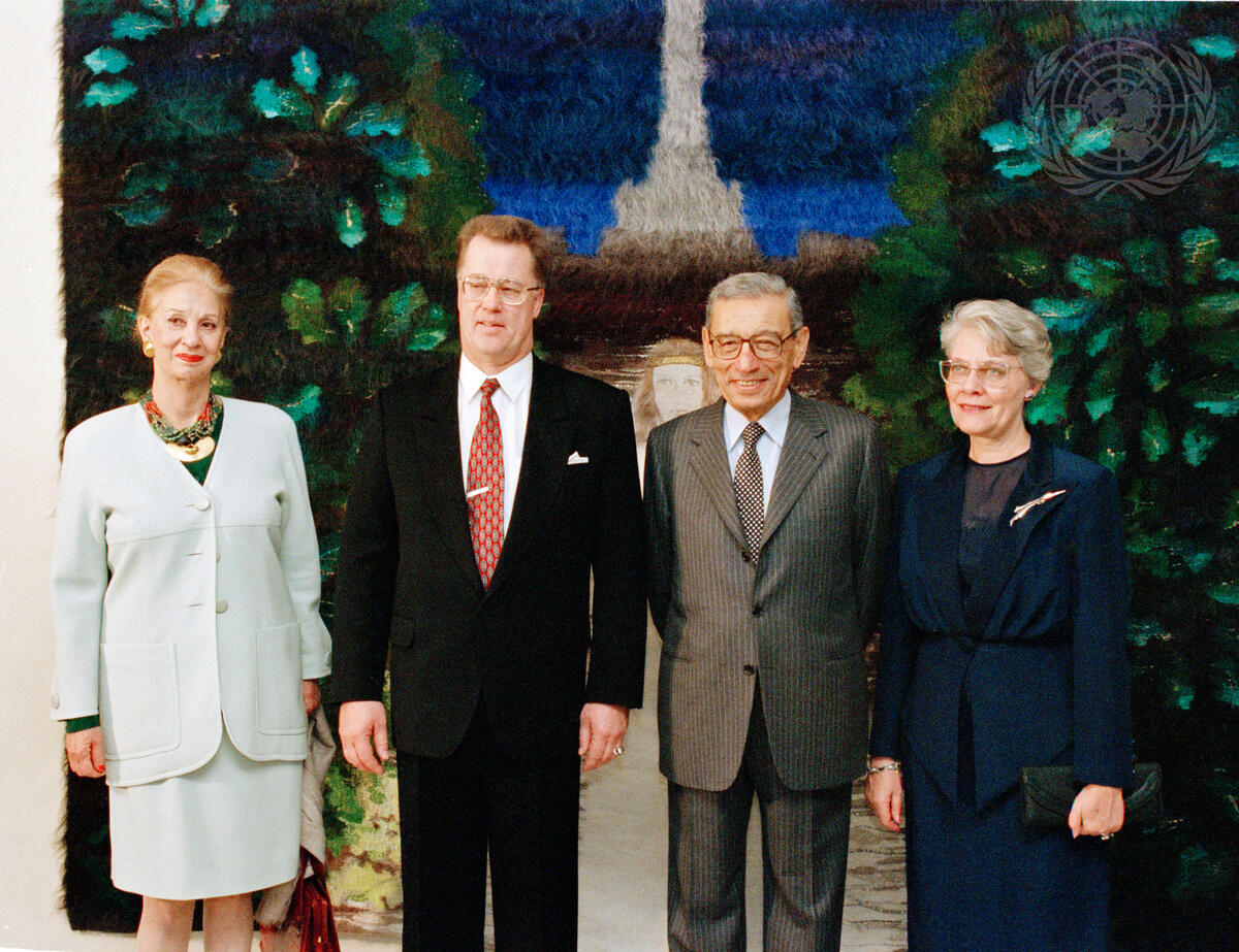 Latvian President Guntis Ulmanis presented an official gift to the United Nations today. The gift, a tapestry called ""Hope"", was created by the Latvian artist Edite Pauls-Vignere. Secretary-General Boutros Boutros-Ghali (second from right) and Latvian President Guntis Ulmanis (second from left) stand in front of the tapestry with their respective wives, Leia Boutros-Ghali (far left) and Aina Ulmane (far right).