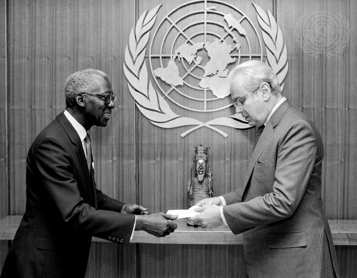 Mr. Sylvester Jarrett (left), Liberia's new Permanent Representative to the United Nations, presenting his credentials today to Secretary-General Javier Pérez de Cuéllar.