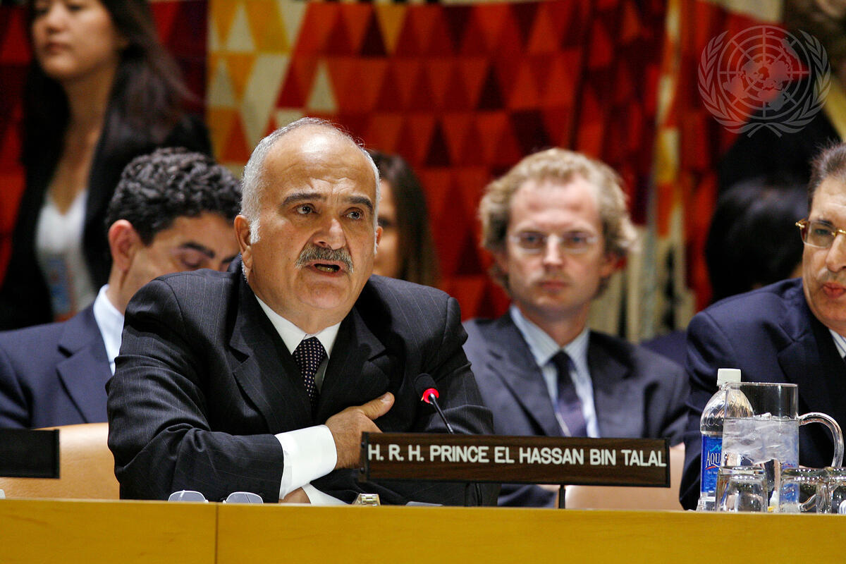 Prince EL- Hassan bin Talal of the Hashemite Kingdom of Jordan (third from left), flanked by Srgjan Kerim (right), President of the sixty-second session of the General Assembly, addresses the one-day informal General Assembly thematic debate on human security.