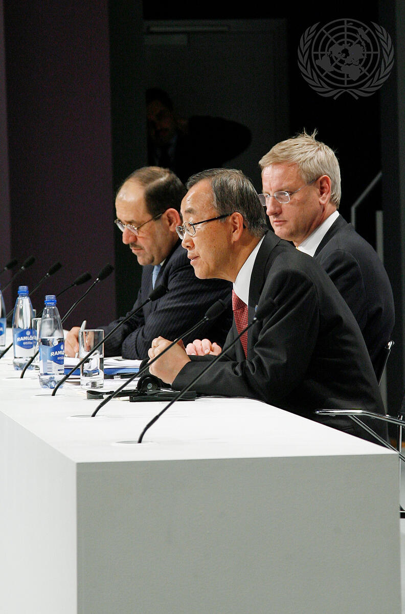 Secretary-General Ban Ki-moon (right) addresses a joint press conference with Nuri Kamel Al-Maliki (left), Prime Minister of Iraq; and Carl Bildt, Minister for Foreign Affairs of Sweden, at the end of the annual review conference of the International Compact for Iraq.