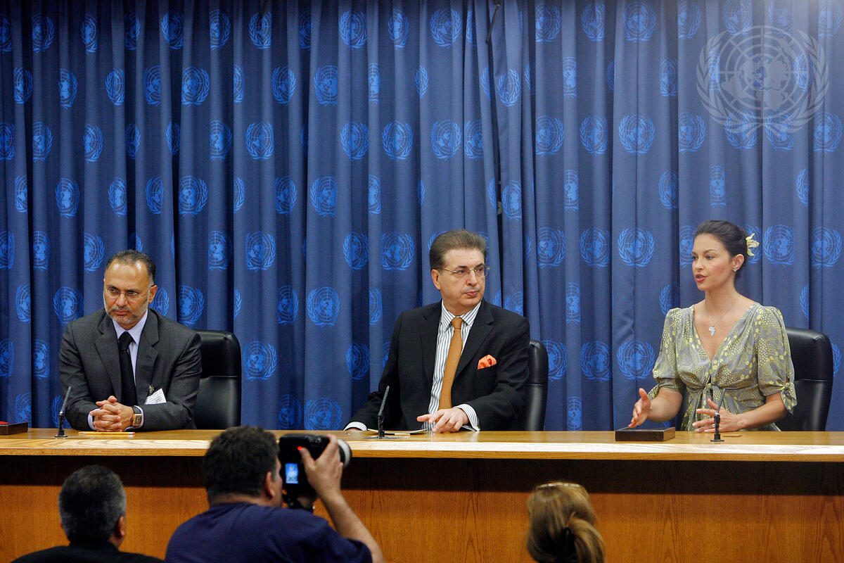 Ashely Judd (right), actress and philanthropist, flanked by Srgjan Kerim (centre), President of the sixty-second session of the United Nations General Assembly, and Anwar Gargash, Minister of State for Federal National Council Affairs of the United Arab Emirates, addresses a press conference following the General Assembly special thematic debate on human trafficking.