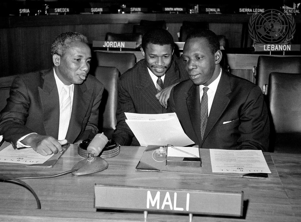 African delegates ponder some paper work in the Sixth (Legal) Committee Room. From left to right: Tiemoko Kompah, of Mali, Secretary of the National Union of Syndicates; Cheick Mbaye, of Guinea, Head of the Department of African Affairs; and Amadou Thiam, of Mali, Head of the Legal Division, Ministry of Foreign Affairs.