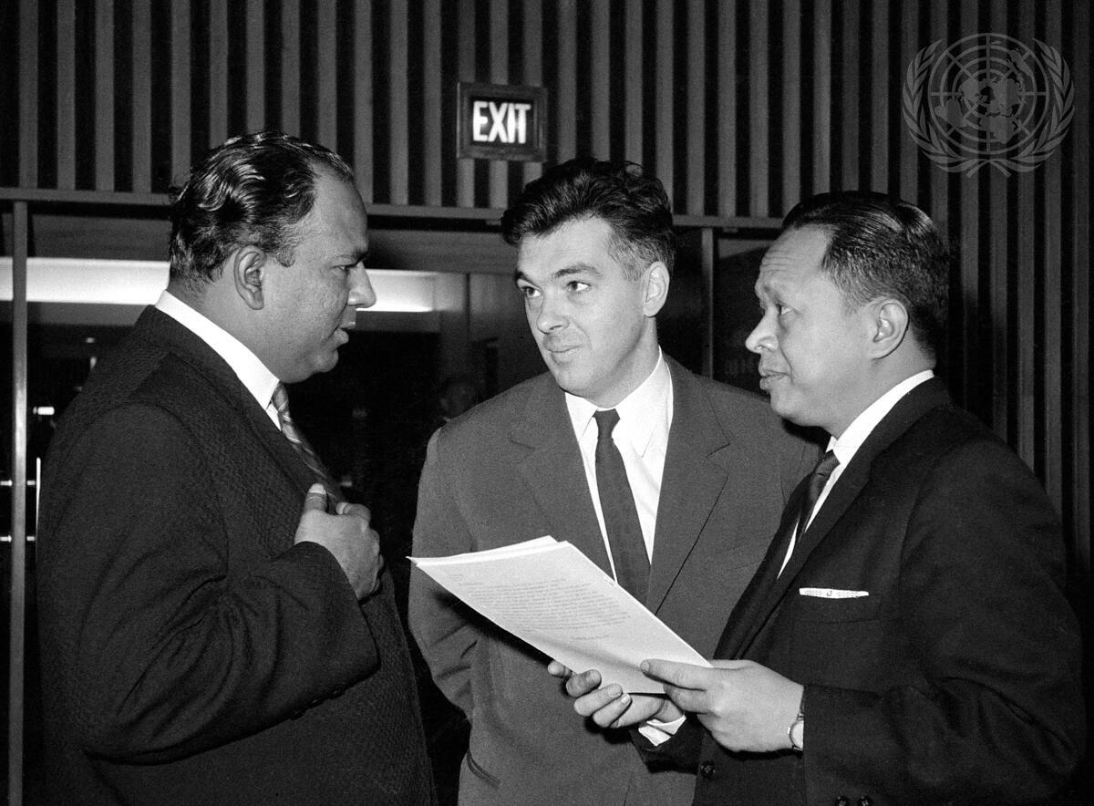 Delegates to the Sixth (Legal) Committee seen here in the Committee Room are (left to right): A.T.M. Mustafa, of Pakistan, Barrister-at-Law; Dr. Milan Sahovic, of Yugoslavia, Head of the International Law Department; and Suffri Jusuf, of Indonesia, Directorate of Legal Affairs, Foreign Affairs Department.