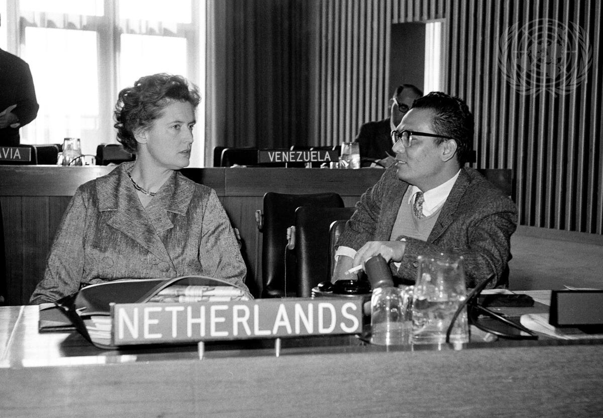 A.P. Schilthuis (left), M.P., of the Netherlands, and Ramanand Sinha, Nepalese Government Advocate, in the Sixth (Legal) Committee Room this morning.