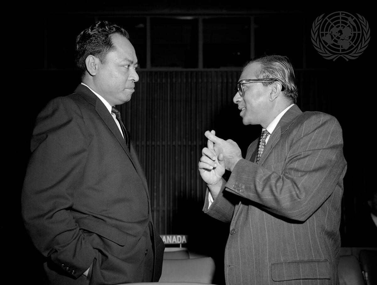 Shortly before the meeting got under way, Mujibur Rahman Khan (right), of Pakistan, is seen exchanging views with Ernesto L. Galingsan, of the Philippines.