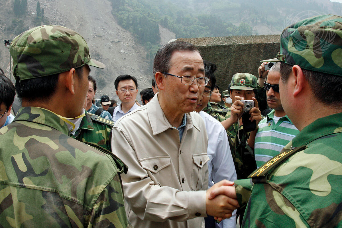Secretary-General Ban Ki-moon (centre) pays respect to the soldiers performing rescue and recovery work of the victims and survivors of the earthquake that has claimed four thousand lives of the ten thousand residents of the township.