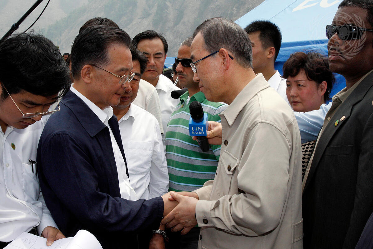 Caption Description Secretary-General Ban Ki-moon (fourth from right) meets with Wen Jiabao, Premier of China, on arrival at the epicentre of the earthquake.