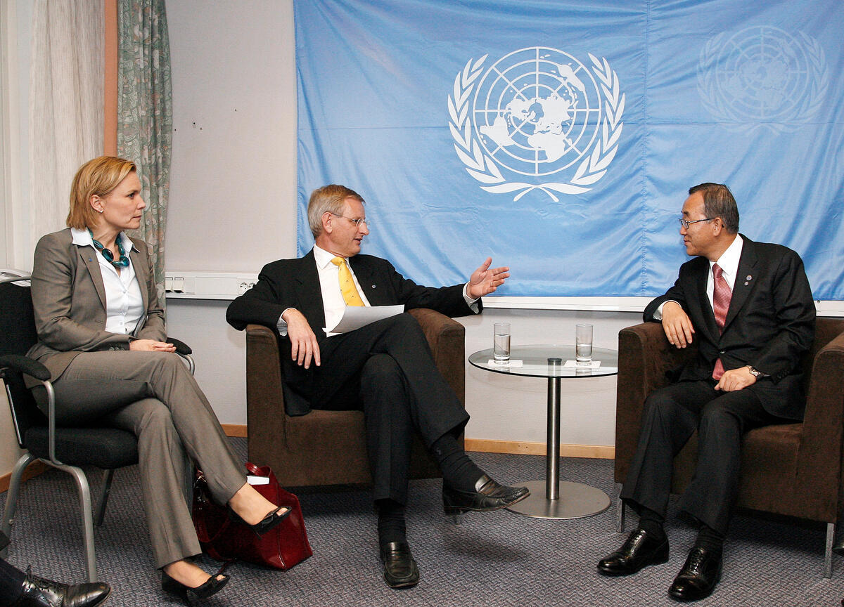 Secretary General Ban Ki-moon (right) holds talks with Carl Bildt (centre), Minister for Foreign Affairs of Sweden, and Gunilla Carlsson, Minister for International Development Cooperation of Sweden.