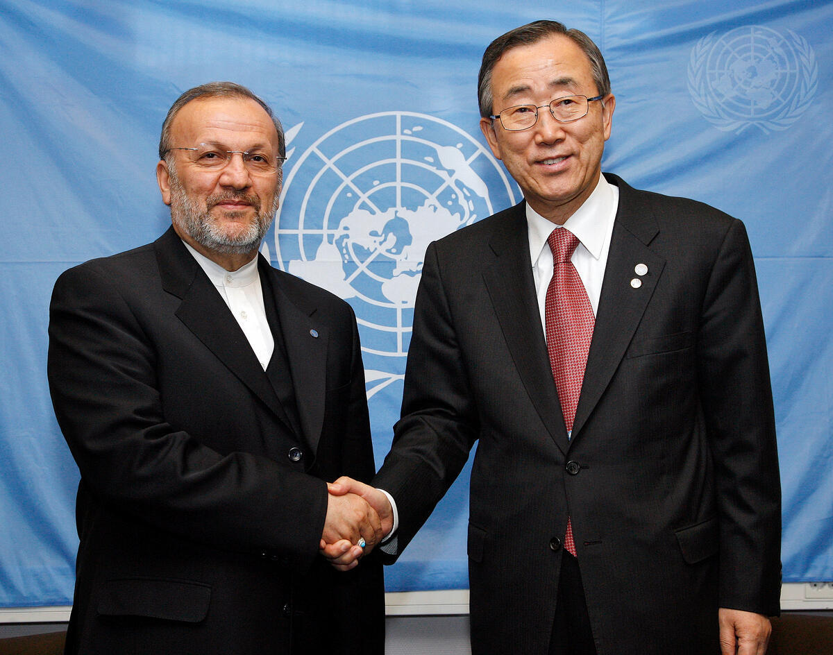 Secretary General Ban Ki-moon (right) meets with Manouchehr Mottaki, Minister for Foreign Affairs of the Islamic Republic of Iran.
