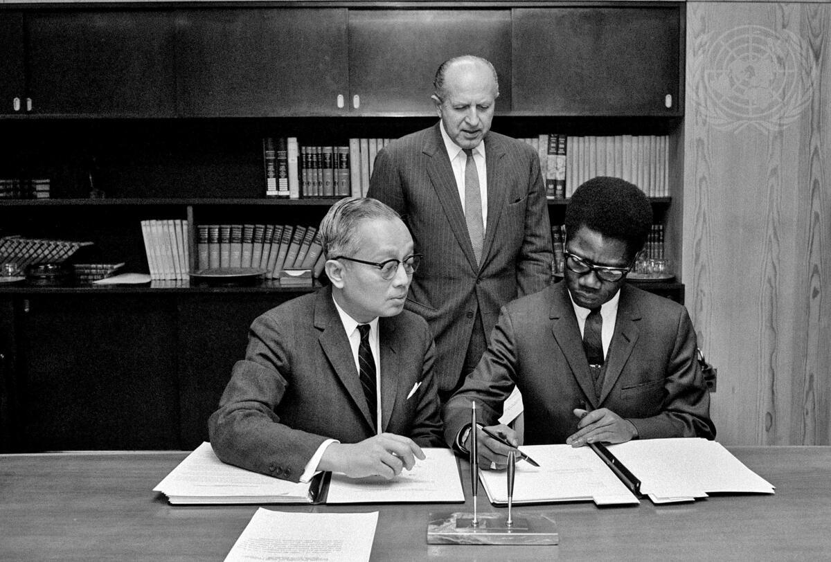 Ambassador Michel Gallin-Douathe (Central African Republic) signing the Convention. At left is Secretary-General U Thant, and in the background is C.A. Stavropoulos, Under-Secretary and Legal Counsel.