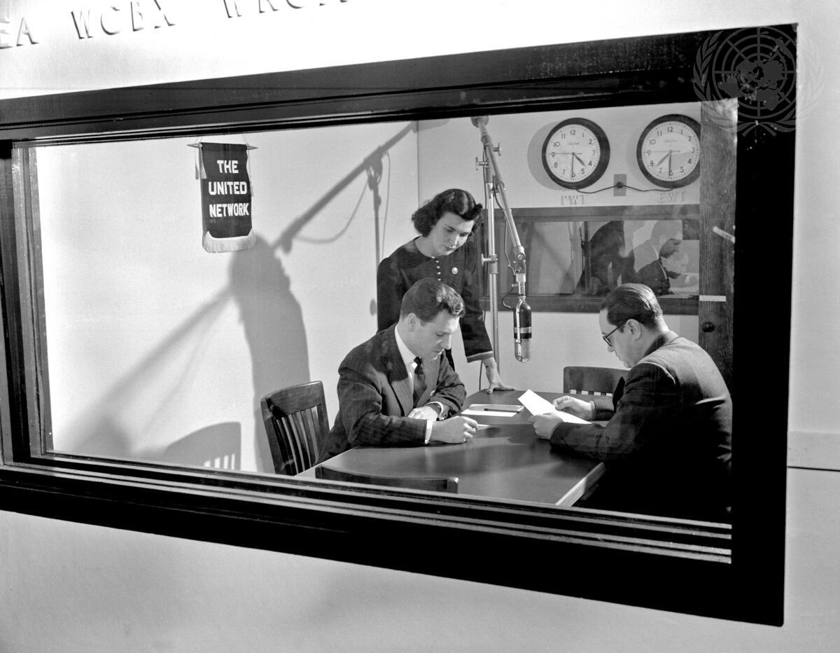 The Conference Radio Section covers the June 6th broadcast for Inter-American Affairs to South America by the United Network. Left to right: Nelson Rockefeller, Assistant Secretary of State; Emilia Veve, producer at station; and Roberto Unanue of the Radio Section.