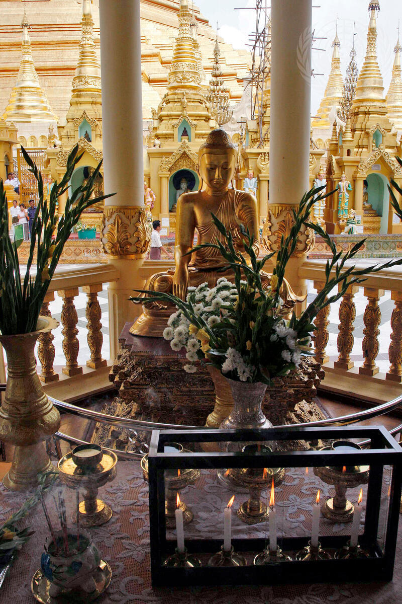 Candles lit by Secretary-General Ban Ki-moon during his visit, burn around the Shwedagon Pagoda, also known as the Golden Pagoda.