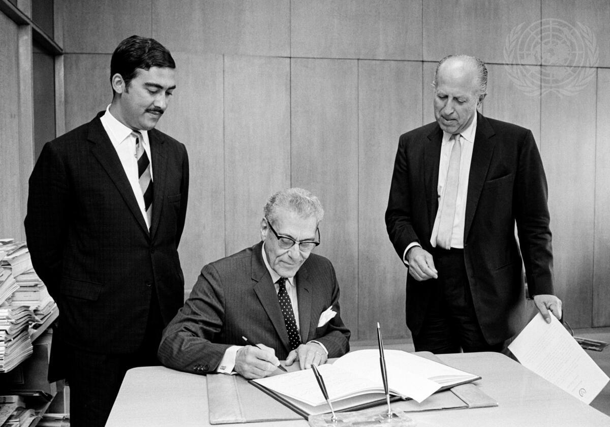 Zenon Rossides, Permanent Representative of Cyprus to the UN, signing the Convention. Looking on are Michael El. Sherifis, First Secretary, Mission of Cyprus to the UN, and C.A. Stavropoulos (right), UN Legal Counsel.