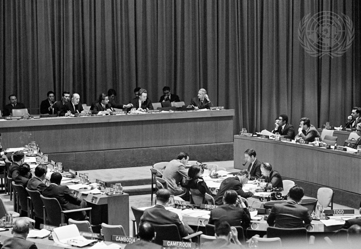 A partial view of the Committee in session, at the presiding table from left to right are: Gheorghe Secarin (Romania), Rapporteur; Anatoly P. Movchan, Committee Secretary; K. Krishna Rao (India), Chairman of the Legal Committee; and Constantin Stavropoulos, United Nations Legal Counsel, addressing the Committee.