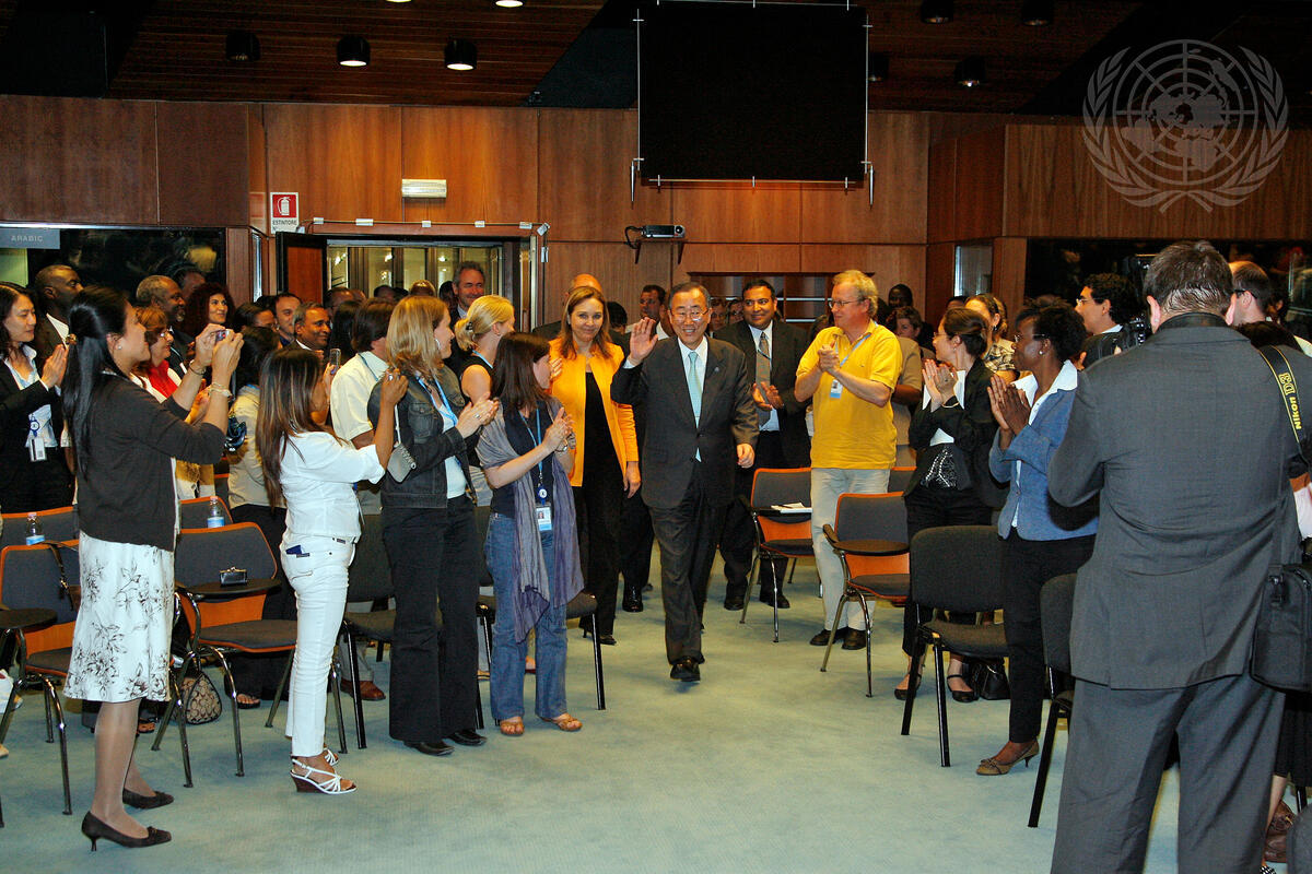 Secretary-General Ban Ki-moon waves upon arrival in the auditorium for an informal meeting with the staff of the United Nations World Food Programme (WFP).