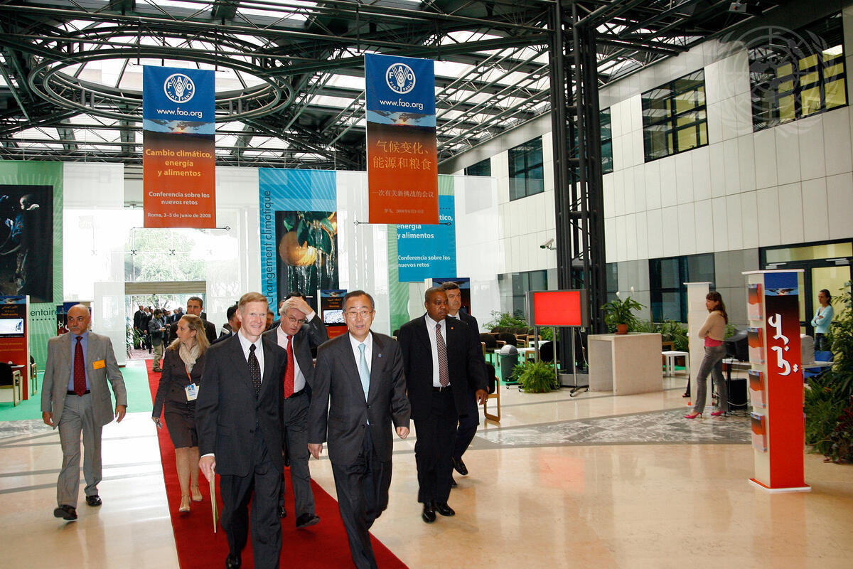 Secretary-General Ban Ki-moon (third from right), accompanied by James G. Butler (fifth from right), Deputy Director-General of the United Nations Food and Agriculture Organization (FAO), arrives at the headquarters of the UN food agency.