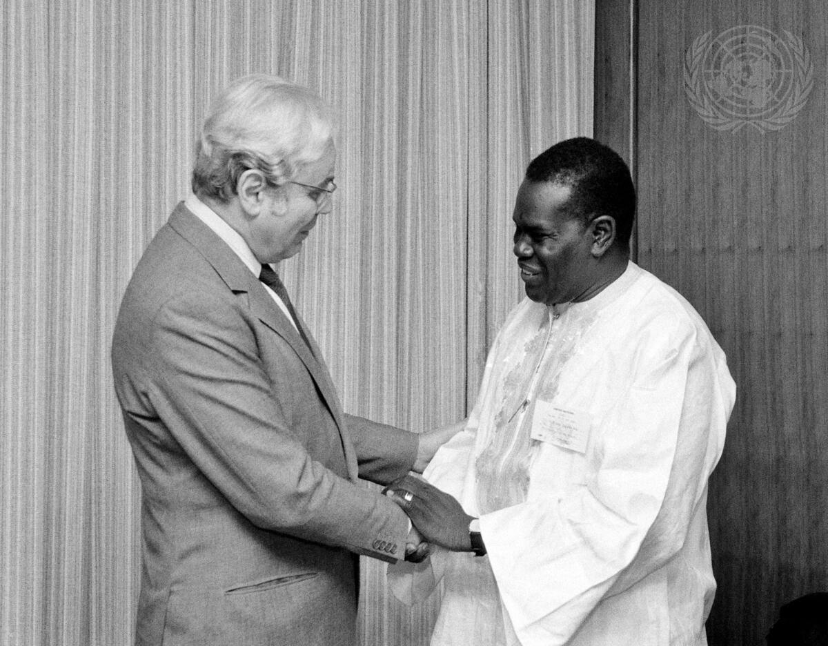 Secretary-General Javier Pérez de Cuéllar (left) today met at United Nations Headquarters with Maître Alioune Blondin Beye, Foreign Minister of Mali.