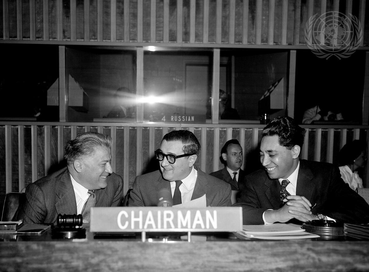 The officers of the Sixth Committee were photographed prior to the meeting today. They are (left to right): Assen Georgiev (Bulgaria), Vice-Chairman of the Committee; Dr. Santiago Perez Perez, (Venezuela), Chairman; and Dr. Abdul Hakim Tabibi (Afghanistan), Rapporteur. Dr. Perez Perez is also Vice-Chairman of the Venezuelan Delegation to the current (12th) session of the General Assembly.