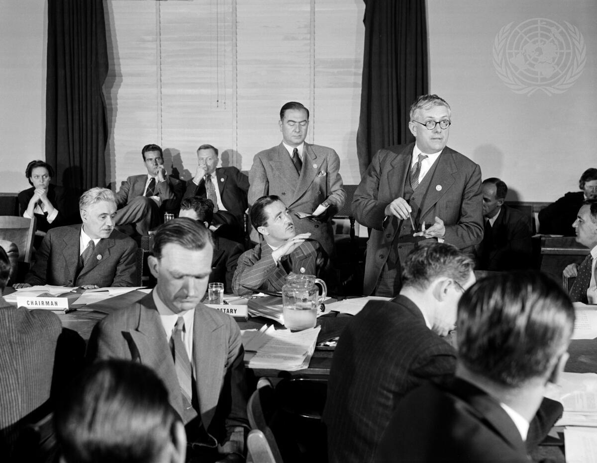 Caption Description Delegates of fifty nations met at San Francisco between April 25 and June 26, 1945. Working on the Dumbarton Oaks proposals, the Yalta Agreement, and amendments proposed by various Governments, the Conference agreed upon the Charter of the United Nations and the Statute of the New International Court of Justice. The Charter was passed unanimously and signed by all the representatives. It came into force on October 24, 1945, when China, France, the USSR, the United Kingdom, the United States and a majority of the other signatories had filed their instruments of ratification. [No exact date]